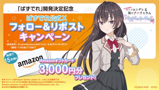 『時々ボソッとロシア語でデレる隣のアーリャさん パズルパーティ!』(略称:ぱずでれ)はゲーム開発決定記念として、本日2024年7月17日(水)より10日間、公式Xにてフォロー&リポストキャンペーンを実施します。本キャンペーンの報酬は「Amazonギフト券3,000円分を合計で15名様」にプレゼントいたします。ふるっての応募をお願いします !