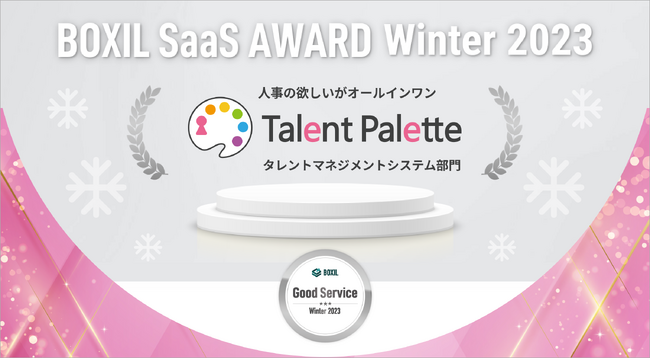 株式会社プラスアルファ・コンサルティング(本社:東京都港区、代表取締役社長:三室克哉、証券コード:4071)は科学的な人材活用や人的資本の開示、人事業務のDX化、リスキリングの推進などを背景に多くの企業で導入が進んでいるタレントマネジメントシステム「Talent Palette(以下「タレントパレット」)」がSaaS(※)比較サイト「BOXIL SaaS(ボクシル サース)」を運営するスマートキャンプ株式会社(本社:東京都港区、代表取締役:林 詩音、以下「スマートキャンプ」)が実施する、「BOXIL SaaS AWARD Winter 2023」のタレントマネジメント部門にて「Good Service」を6期連続で受賞しましたことをお知らせします。