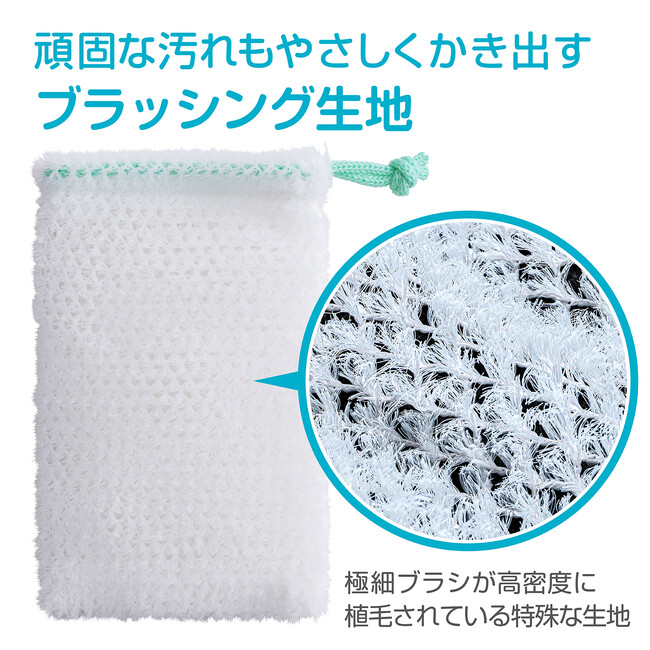 単体だと泡立ちにくい固形せっけんを入れてこすることで、洗濯機洗いだけでは落ちにくい頑固な汚れも落としやすくします。特殊なブラッシング生地を採用し、汚れをしっかりかき出します。
