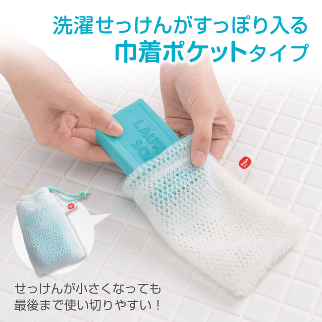 せっけんが小さくなっても最後まで使い切りやすい巾着ポケットタイプです。