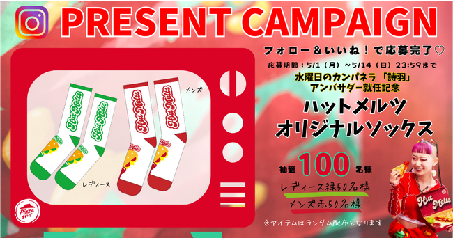 ・キャンペーン概要:抽選で100名様に水曜日のカンパネラ詩羽さんアンバサダー就任記念「ハットメルツオリジナルソックス」をプレゼント ・キャンペーン期間:2023年5月1日(月) ~5月14日(日)23:59・キャンペーン応募参加条件:1.ピザハット公式Instagramアカウント「@Pizza_Hut Japan( https://www.instagram.com/pizza_hut_japan)」をフォロー2.キャンペーン投稿画像へのいいね