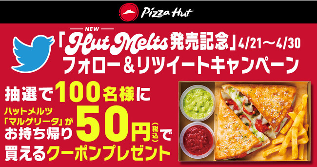 ・キャンペーン概要:抽選で100名様に「Hut Melts」のマルゲリータトッピングがお持ち帰り50円(税込)で買えるクーポンプレゼント・キャンペーン期間:2023年4月21日(金) ~4月30日(日)23:59・キャンペーン応募参加条件1.ピザハット公式Twitterアカウント「@Pizza_Hut Japan( https://twitter.com/Pizza_Hut_Japan )」をフォロー2.ピザハット公式Twitterのキャンペーンツイートをリツイート