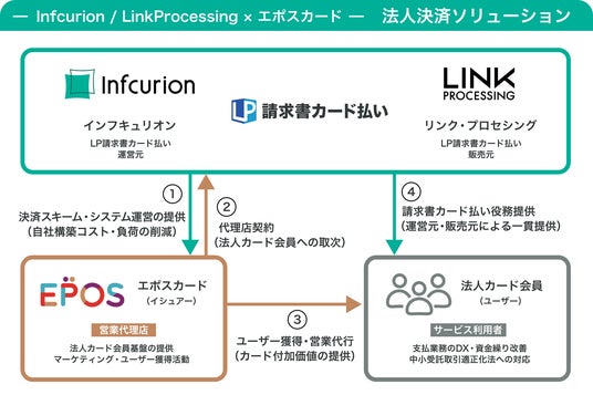 株式会社インフキュリオン(本社:東京都千代田区、代表取締役社長CEO 丸山弘毅、以下「インフキュリオン」)のグループ会社である株式会社リンク・プロセシング(本社:東京都千代田区、代表取締役社長 齊藤篤史、以下「リンク・プロセシング」)は、株式会社エポスカード(本社:東京都中野区、代表取締役社長 相田昭一、以下「エポスカード」)と業務提携し、2026年2月19日より「法人向け請求書カード払い」サービスを、エポスカードの法人カード会員向けに提供開始します。本サービスにより、銀行振込が主流だった請求書払いをカード決済(カード払い)に切り替えることが可能となり、窓口納付が一般的だった社会保険料の支払いにも対応するなど、法人の経理業務の効率化とキャッシュフロー改善を支援します。