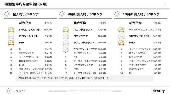 ・[職種別平均希望単価]10月新規人材において、「データベースエンジニア」が他と大きく差をつけて1位となりました。