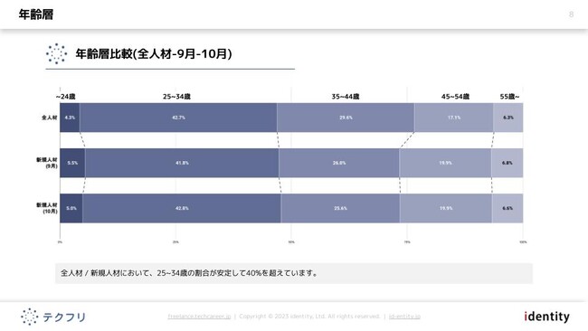 ・[年齢層]全人材 / 新規人材において、25~34歳の割合が安定して40%を超えています。