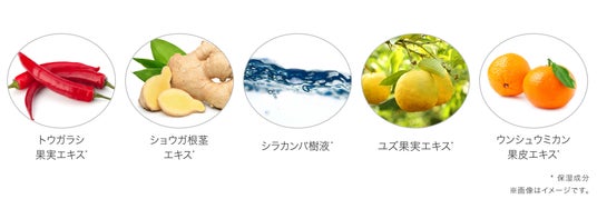 トウガラシ果実エキス*6、ショウガ根茎エキス*6、シラカンバ樹液*6、ユズ果実エキス*6、ウンシュウミカン果皮エキス*6といった植物由来の美容成分を配合。ひきしまったすべすべ美肌へ導きます。