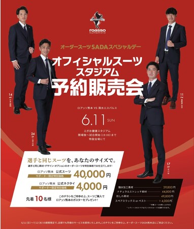 初回19,800円(税込21,780円)~オーダースーツを提供する株式会社オーダースーツSADA(本社:東京都千代田区、代表取締役社長:佐田展隆)は、2023年6月11日(日)に、ロアッソ熊本 オフィシャルスーツの予約販売会を、開場後~試合開始(19:00)まで、えがお健康スタジアム特設会場にて開催いたします。オーダースーツSADAは、オフィシャルスーツサプライヤーとして、ロアッソ熊本を応援しています!