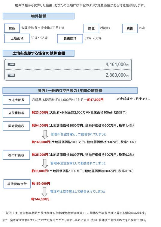 - 空き家の建物情報をもとに、管理コストや解体費用・土地売却査定価格をまとめたレポートを発行できる「空き家レポート作成代行サービス」の活用