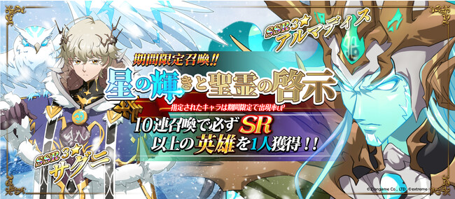 『星の輝きと聖霊の啓示』は10連召喚で必ずSR以上の英雄を一人獲得できる、期間限定召喚です。SSR覚醒者の出現確率が期間限定でアップします。