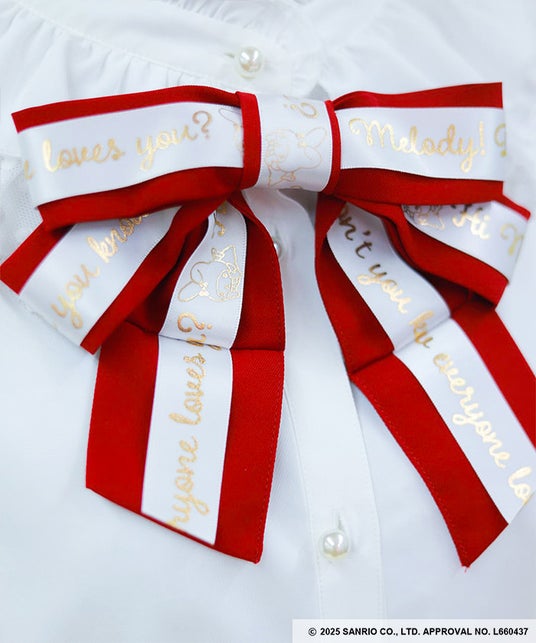 マイメロディへの愛が溢れたメッセージをプリントした、リボンブローチがセットになったブラウスです♪