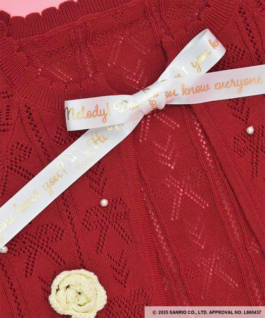 マイメロディへのメッセージをプリントしたリボンテープを前で結んで着脱する仕様です。