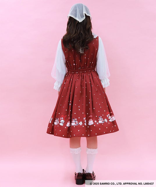 ケーキやお菓子を用意して、お茶会の準備をするマイメロディをイメージしたオリジナルプリントのジャンスカです。