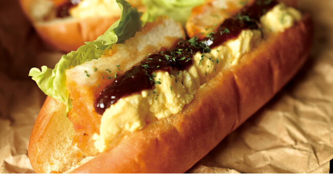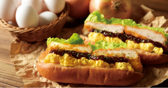 ソフトフランスパンにやわらかなチキンフィレとマイルドなおいしさのたまごサラダをはさんだ、春らしい色合いの親子サンドです。玉ねぎたっぷりソースでお召し上がりください。