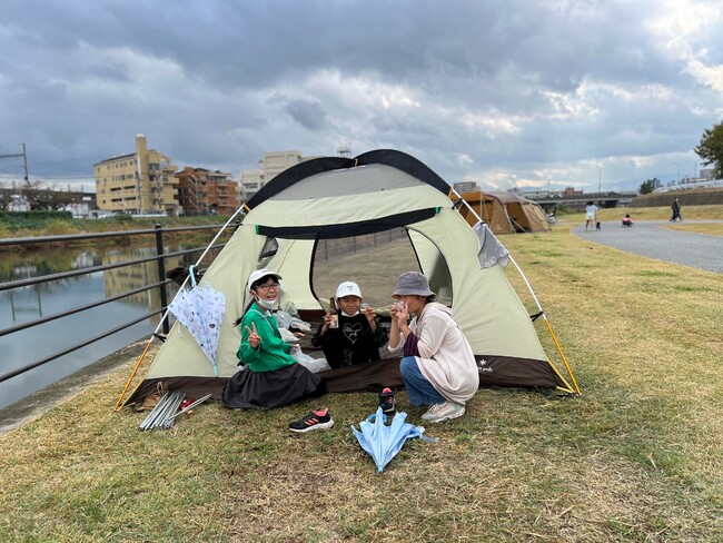 キャンプ場ではない空間でもテントがあるだけで雰囲気は明るく、人々の集う憩いの空間になりました。