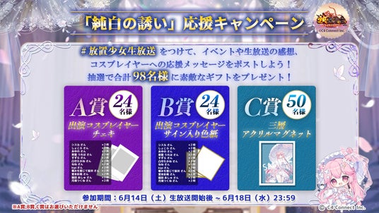6月14日(土)生放送開始後~6月18日(水)23:59まで、「#放置少女生放送」をつけて、イベントや生放送の感想、コスプレイヤーへの応援メッセージなどをポストしてくれた方の中から抽選で合計98名様に素敵なギフトをプレゼント!