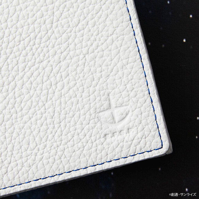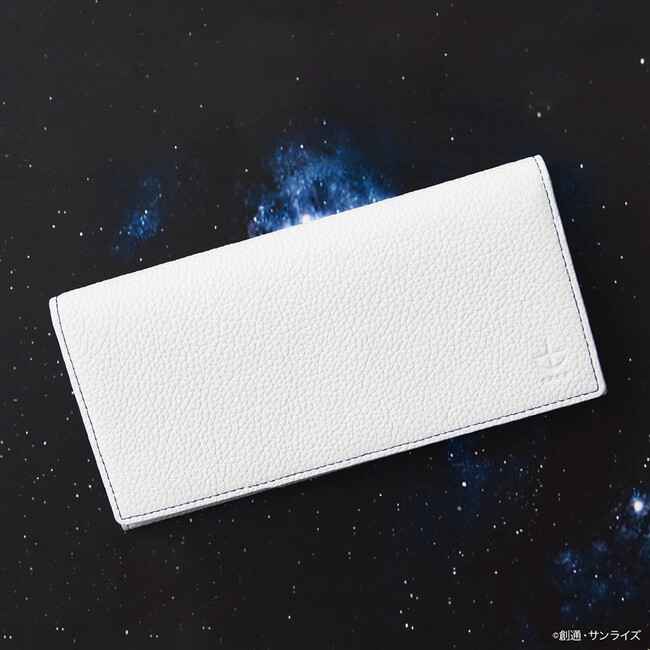 シンプルなホワイトのレザーにガンダムをイメージしたブルーのステッチと地球連邦軍の型押しを施したシンプルな長財布は、内装とのギャップがインパクト大。