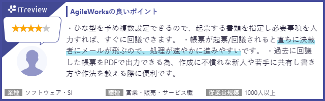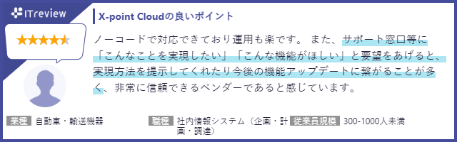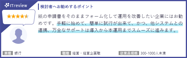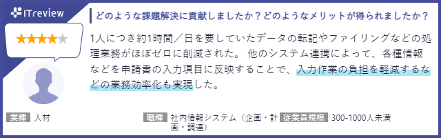 きめ細かなサポート対応や、柔軟なシステム連携によりスピーディーな業務効率化が実現可能な点などをご評価いただき、高い満足度につながりました。今回の集計期間内において投稿いただいたレビューの一部をご紹介いたします。