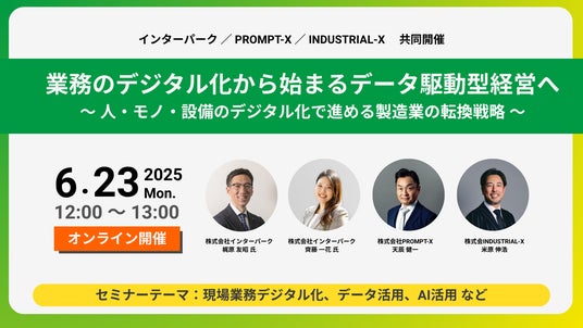 データドリブン経営によって企業変革を支援する株式会社INDUSTRIAL-X(本社:東京都港区、代表取締役:八子 知礼、以下当社)は、2025年6月23日(月)に「業務のデジタル化から始まるデータ駆動型経営へ」を開催することをお知らせします。
