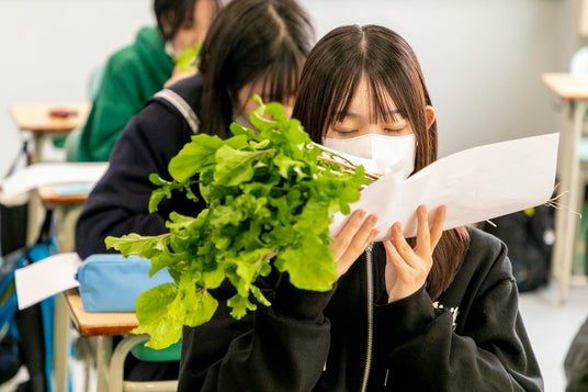 今回は、静修高校普通科に新設されたパティシエコースの第1期生を対象に授業を実施。香りの素材には、調理にまつわるハーブ(ルッコラ・バジル・パクチー)を採用しました。生徒たちは、ハーブの香りの主張の強さに驚き、特有の香りの違いを楽しみながら、浮かんだ情景や色、印象などを自由に言葉で表現していました。「香りから物語を創る体験は新鮮だった」「いかに日頃から視覚に囚われているかを実感した」など、新たな発見もたくさんあったようです。