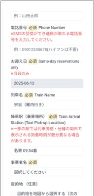 2.「氏名」「電話番号」を直接入力、「列車名」「降車駅」はプルダウンから選択する。(利用日はWEBフォームを読み込んだ日に自動設定)