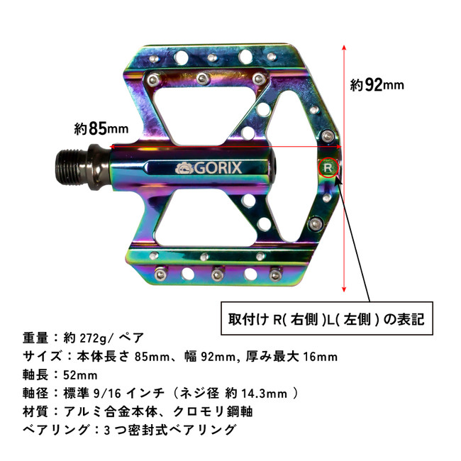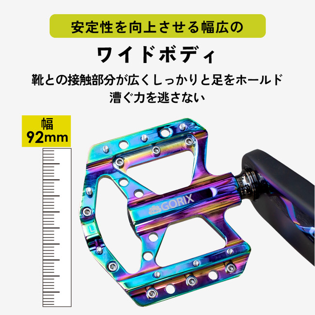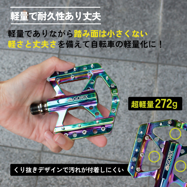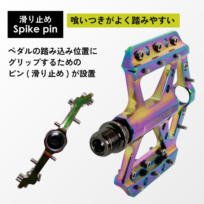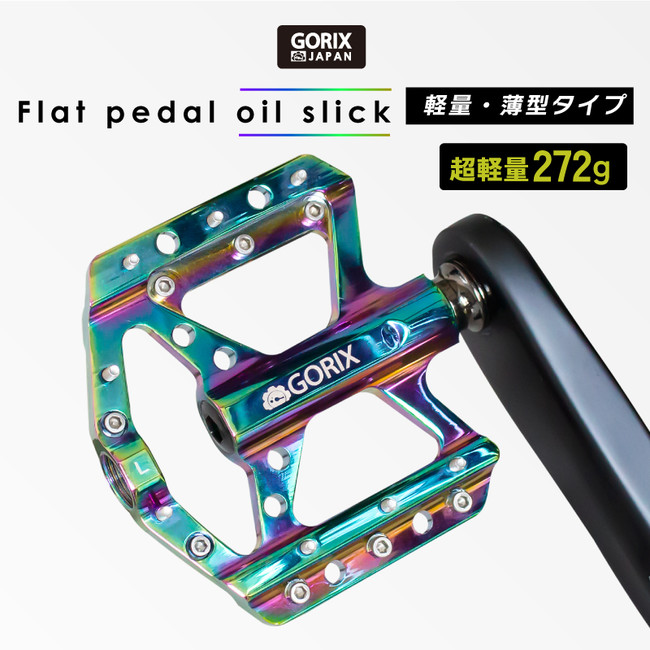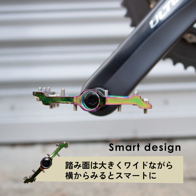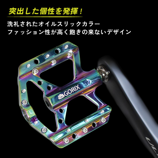 薄型デザインでワイドな踏み面で、くり抜きデザインは超軽量になっており、踏みやすく食いつきが良く、デザイン性と実用性を兼ね揃えたオイルスリックカラーのフラットペダルです。