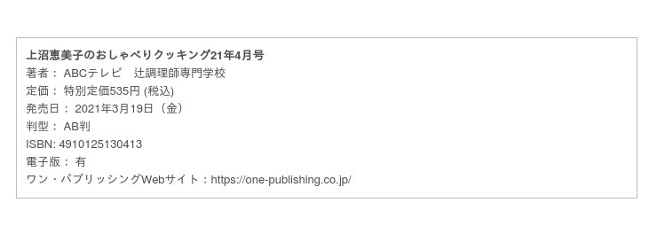 株式会社 ワン・パブリッシング(東京都台東区/代表取締役社長:廣瀬有二)は、2021年3月19日(金)に「上沼恵美子のおしゃべりクッキング4月号」(特別定価:535円(税込))を発売いたしました。この号は、3月29日~4月30日までの5週分のレシピをぜ~んぶ掲載。また、辻調理師専門学校の先生方直伝の”いつもの料理をおいしくするコツ”が満載の別冊付録(オールカラー28ページ)つきです。巻頭では、200名様に当たる春のうきうき大プレゼント企画もあります。