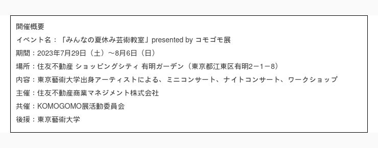 住友不動産商業マネジメント株式会社(本社:東京都新宿区 取締役社長:山本 直人)が、運営する複合商業施設「住友不動産 ショッピングシティ 有明ガーデン」(所在:東京都江東区)において実施するイベント『みんなの夏休み芸術教室』についてお知らせいたします。