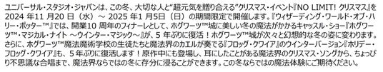 東京ではワーナー ブラザース スタジオツアー東京にて、シーズンイベント「ホグワーツ・イン・ザ・スノー」が日本初開催、赤坂サカスでは、12月から新たなハリー・ポッターツリーを設置、大阪ではユニバーサル・スタジオ・ジャパンにて、『NO LIMIT! クリスマス』が開催となり、10周年を迎えた『ウィザーディング・ワールド・オブ・ハリー・ポッター(TM)』でも2024年11月20日(水)~2025年1月5日(日)の期間限定で『ホグワーツ(TM)・マジカル・ナイト ~ウインター・マジック~』『ホリデー・フロッグ・クワイア』が5年ぶりに開催!また、現在東京・横浜・名古屋・福岡に展開している「ハリー・ポッター マホウドコロ」が、2025年1月13日(月)までの期間限定で札幌でもポップアップストアを初出店中です。また、MARK IS 福岡ももち(福岡市中央区)にて11月22日(金)から12月25日(水)まで「ハリー・ポッター ホグワーツのクリスマス」が初開催となります。
