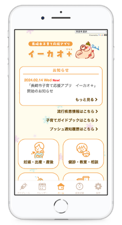 ホームページのイーカオに加えて新たな情報発信媒体で子育て家庭にとって今まで以上に様々なお役立ち情報をお届けし、子育てをより豊かなものにしてほしいという想いを込めて「長崎市子育て応援アプリ イーカオ+」と命名しました。トップページには、長崎市子育て支援キャラクターの「イーカオ」が登場。長崎市らしさが詰まった こだわりのデザインでお届けします。