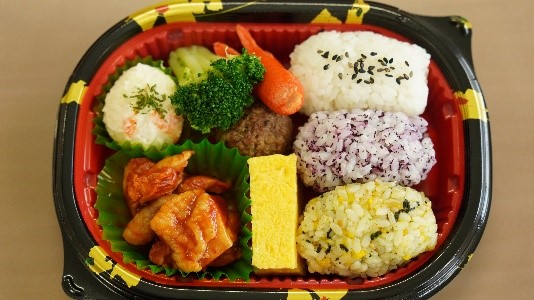 (2) 商品特徴:男女問わず、様々な世代に楽しんでもらいたいという開発コンセプトにし、三色おにぎり(ごま、ゆかり、のりたま)とトマトチキン煮込みをメインに考えたお弁当になります。商品名は主食材の三色おにぎりとトマトチキン煮込みを短縮しながら、語呂良く、程よく覚えやすい名前にしながら決定しました。いわき産食材はおにぎり各種の白飯にいわきライキ、トマトチキン煮込みにはワンダーファーム様のトマト、椎茸ボールには小川きのこ園様の椎茸を使用しています。