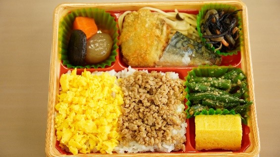 (2) 商品特徴:地産地消に着目した上で、たくさんのおかずが入ったお弁当にしたいという開発コンセプトにし、そぼろとサバの味噌煮を主にしたお弁当になります。商品名は主食材で必須のおかずだったそぼろとサバの味噌煮を短縮と繰返しにより、かわいさとインパクトを持たせた商品名にしました。いわき産食材は白飯のいわきライキ、きのこパスタには小川きのこ園様のエリンギを使用しています。