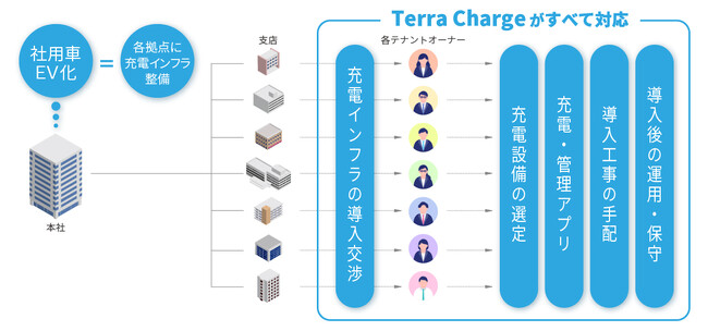 Terra Chargeは、法人での社用車EV化を支援すべく、「Terra Charge 法人プラン」の提供を開始いたしました。EV充電の導入場所が自社所有の駐車場ではない場合でも、導入交渉から運用保守といったアフターサポートまで、ワンストップで提供いたします。