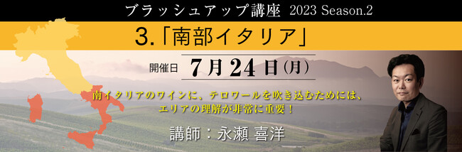 ヴィノテラス ワインスクール(本社:東京都千代田区、代表取締役:市原 岳洋)が、ソムリエ・ワインエキスパート有資格者向けの「ブラッシュアップ講座Season.2 第3回南部イタリア」を7月24日に開講いたします。