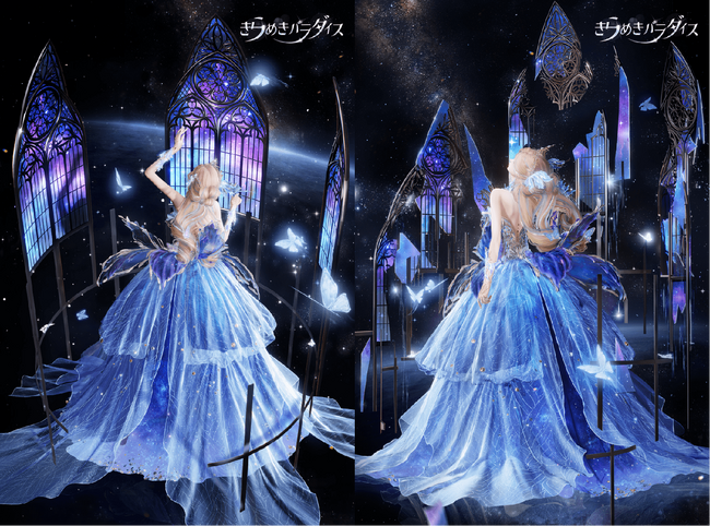 まるで銀河を映し出すようなドレスには、輝く星々が散りばめられ、壮大な宇宙を思い出させます。髪型には細かいメッシュが数多く入っており、ふわりと大きなカールが上品さを際立てます。背中アクセの鳥籠は、2つのスタイルを楽しむことができますよセットをコンプリートすると、専用動作ポーズを獲得できますよ。