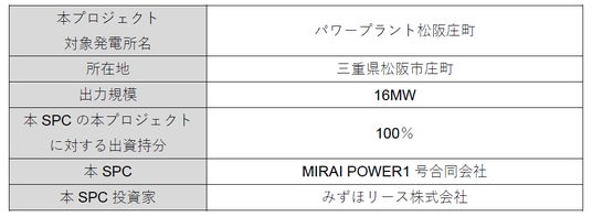 本プロジェクトは、本SPCを通して出資参画した青森県上北郡六ヶ所村、茨城県高萩市安良川、三重県鳥羽市堅子町、三重県津市白山町、熊本県球磨郡錦町、三重県松阪市嬉野釜生田町、岩手県久慈市侍浜町、鹿児島県指宿市山川大山において稼働する8か所の特別高圧太陽光発電所に続く第六弾として、三重県松阪市庄町において稼働する1か所の特別高圧太陽光発電所(出力規模16MW)を対象としており、各発電所を合わせた出力規模は累計244MWとなります。