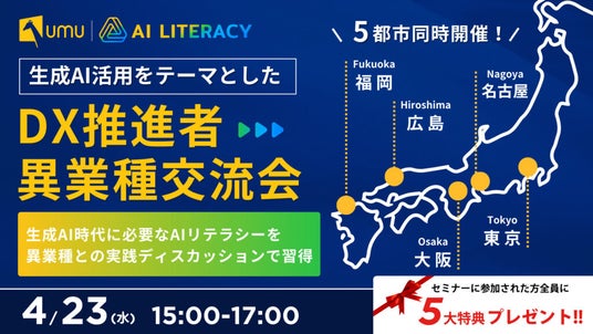 ユームテクノロジージャパン株式会社(本社:東京都新宿区、代表取締役:松田しゅう平、https://www.umujapan.co.jp、以下 ユームテクノロジージャパン)は、異業種の参加者同士が企業内の生成AI活用における課題・悩み・アイデアを共有し、新たなインサイトを得る場「DX推進者 異業種交流会」を、2025年4月23日(水)15:00~より、東京・大阪・名古屋・広島・福岡の5都市同時開催いたします。