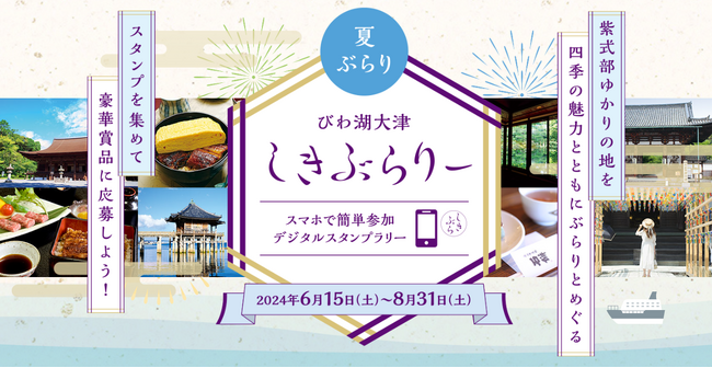 滋賀県大津市には、『源氏物語』起筆の地として伝わる石山寺をはじめ、紫式部ゆかりの地や紫式部・源氏物語に関連したイベント、グルメスポットなど見所がたくさんあります。そんな紫式部ゆかりの地・びわ湖大津をめぐるデジタルスタンプラリー「しきぶらり~」の第2弾として「夏ぶらり」を開催します。ダブル開催中の特典キャンペーン「しきぶら」とあわせて、楽しく・おトクに・簡単に旅してみませんか?