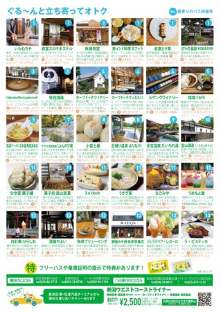 ■特典協賛店:いわむろや、岩室スロウホステル、角屋悦堂、南インド料理ネファラ、岩室とり蔦、灯りの食邸KOKAJIYA、Taibow! coffee & gelato soft、笹祝酒造、カーブドッチワイナリー、カーブドッチヴィネスパ、ルサンクワイナリー、燦燦CAFE、新潟ラーメンなみ福 角田浜本店、サウナと天然温泉 じょんのび館、小冨士屋、日帰り温泉よりなれ、多宝温泉 だいろの湯、宝山酒造、ジェラテリア・レガーロ、ラ・ビステッカ、分水堂菓子舗、菓子処西山製菓、3 o’clock、うさぎ家、なごみや、うめもと屋、社彩庵ひらしお、酒屋やよい、弥彦ブリューイング、越後みそ西弥彦笹屋店の30店舗