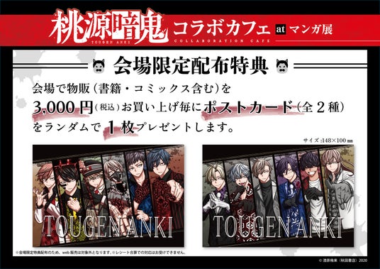 詳細及び最新情報は「『桃源暗鬼』コラボカフェ at マンガ展」特設ページもしくは「マンガ展/TORICO」公式Xアカウントをご覧ください。
