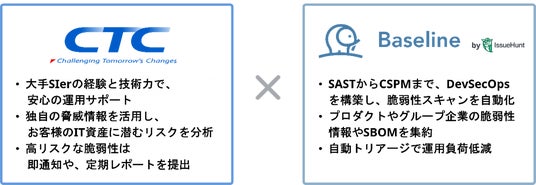 これまで、当社は日本最大のバグバウンティ・プラットフォーム「IssueHunt」を通じ、多くの企業と協力し、脆弱性の早期発見と修正を支援してきました。今回、CTCとの業務提携により、当社のアプリケーションセキュリティポスチャー管理(ASPM)ツール「Baseline」と、CTCが提供する高度な脅威・脆弱性情報を組み合わせることで、企業のIT資産に潜むリスクを迅速かつ正確に特定し、即座に対応する体制を整えることができます。