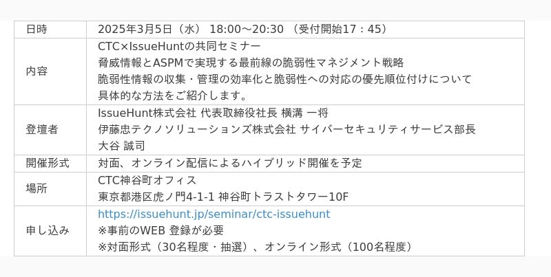 伊藤忠テクノソリューションズ株式会社(代表取締役社長:新宮 達史、本社:東京都港区、略称:CTC)とIssueHunt株式会社(代表取締役社長:横溝 一将、本社:東京都中央区、以下:IssueHunt)は、業務提携契約を締結し、脆弱性情報の収集・分析サービス「Baseline for CSIRT」を提供します。本サービスを通じて、企業のIT資産のセキュリティリスクの低減と安定運用を図り、脆弱性情報の悪用によるシステム被害を予防します。
