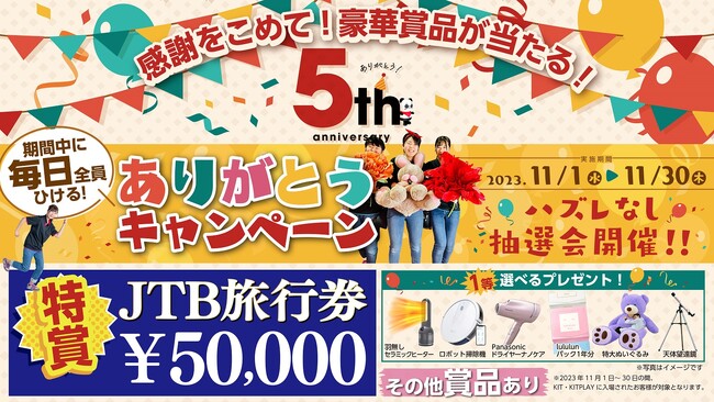 キスケ株式会社(本社:愛媛県松山市、代表:山路義則)が運営する四国最大級のエンターテインメント施設「キスケBOX」(愛媛県松山市)内の「KIT」では、5周年を記念してありがとうキャンペーンを開催します。日頃来店してくれているお客様に入場時に抽選を楽しんでもらい、様々な賞品が当たる可能性があります。