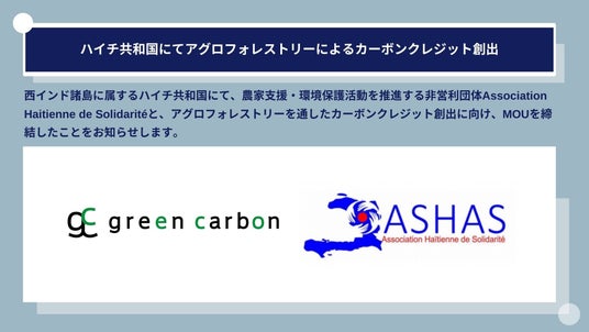 ネイチャーベースのカーボンクレジット創出販売事業を展開するGreen Carbon株式会社(代表取締役:大北潤、以下Green Carbon(読み:グリーンカーボン))はこの度、西インド諸島に属するハイチ共和国(以下、ハイチ)にて、農家支援・環境保護活動を推進する非営利団体Association Haitienne de Solidarite(以下 ASHAS※1)と、アグロフォレストリー※2を通したカーボンクレジット創出に向け、MOUを締結したことをお知らせします。20年間で約500万トンのクレジット創出により、ハイチの生態系再生と地域経済発展を目指します。