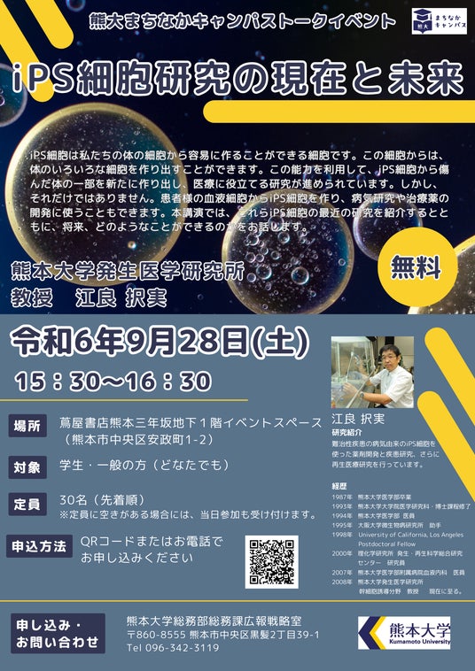 iPS細胞は、私たちの体の細胞から容易に作ることができる細胞です。この細胞からは、体のいろいろな細胞を作り出すことができます。この能力を利用して、iPS細胞から傷んだ体の一部を新たに作り出し、医療に役立てる研究が進められています。しかしそれだけではなく、患者様の血液細胞からiPS細胞を作り、病気研究や治療薬の開発に使うこともできます。本講演では、これらiPS細胞の最近の研究を紹介するとともに、将来どのようなことができるのかをお話します。また、当日会場では熊大オリジナルグッズの販売会を行う予定です。