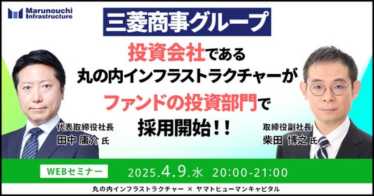 ヤマトヒューマンキャピタル株式会社(本社:東京都千代田区、代表取締役:堀江 大介)は、2025年4月9日(水) 20:00よりオンラインにて、丸の内インフラストラクチャー株式会社 代表取締役社長 田中 庸介氏、同社取締役副社長 柴田 博之氏にご登壇いただくウェビナー『三菱商事グループ投資会社である丸の内インフラストラクチャーが、ファンドの投資部門で採用開始!!』を開催いたします。