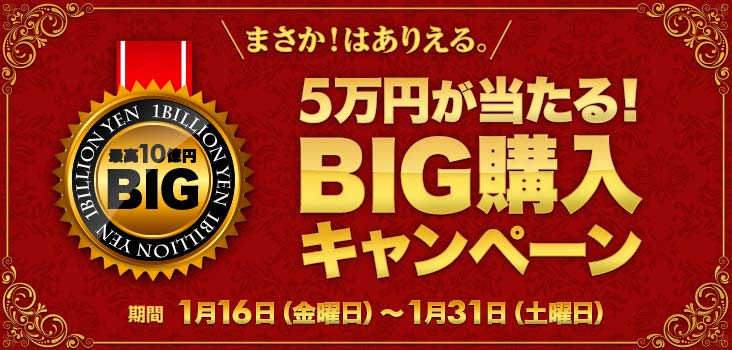 なお、通常のBIGは、キャリーオーバー発生時の1等最高当せん金額は6億円ですが、今回のキャンペーンの対象となる第745回のBIGは、最高当せん金額が10億円になります(※)。販売期間は、2015年1月17日から2015年1月31日までとなります。