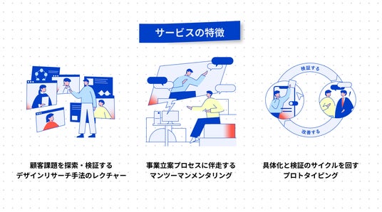 企業の体制に寄り添い柔軟なデザインの伴走支援を行います。HCD専門家・スペシャリストとUIデザイナーが参加者の「顧客視点」を養い、事業アイデアのブラッシュアップからプロトタイピングによる具現化まで一貫してサポートします。
