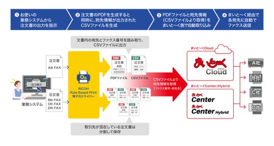 まいと~くシリーズは、専用ファクス機や複合機を介して紙でファクスのやり取りをしている業務をペーパーレス化するソリューションです。この度の連携で、RICOH Rule Based Print 電子化ドライバーがPDFデータを出力する際、まいと~くのファクス送信依頼ファイル(CSV)を生成できるようになりました。このデータをまいと~くが取り込むことで、ファクスを自動で送信することが可能となります。従来、手作業で行っていた注文書等のファクス送信業務を、システム改修や運用変更なく自動化し、担当者の業務効率の向上とペーパーレス化に貢献します。