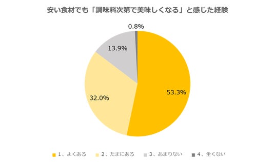 安い食材でも「調味料次第で美味しくなる」と感じた経験の有無について、53.3%が「よくある」、32%が「たまにある」と回答しており、全体で85%が「調味料次第で美味しくなる」と感じていることがわかりました。