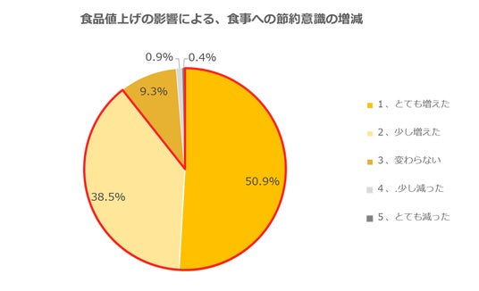 食品値上げの影響による食事への節約意識の増減について聞いたところ、89%が「増えた」、うち約半数の50.9%が「とても増えた」と回答しました。